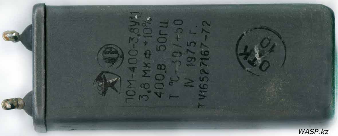 Мой экземпляр был извлечен из старой советской лампы дневного освещения. На конденсаторе нанесена такая маркировка: Знак Качества, логотип производителя — Ленинаканский конденсаторный завод. Затем название модели ЛСМ-400-3,8У11. 3,8 МКФ ±10% 400 В 50Гц. ТС -30/+50. Дата изготовления — IV 1975 г. ТУ16527167-72.