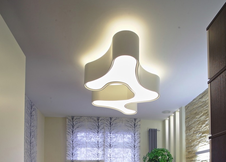 Отсутствие натяжного потолка приводит к невозможности установки встраиваемых светильников, поэтому придется обратить внимание на накладные устройства, люстры с плоской формой, трековые изделия и светодиодные панели