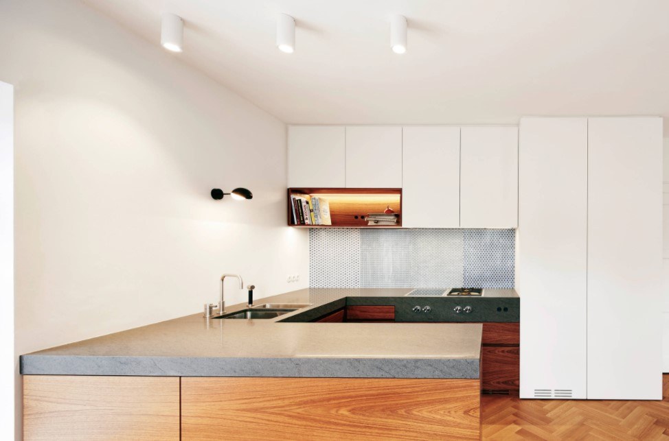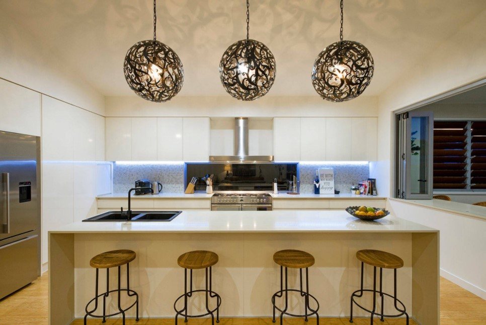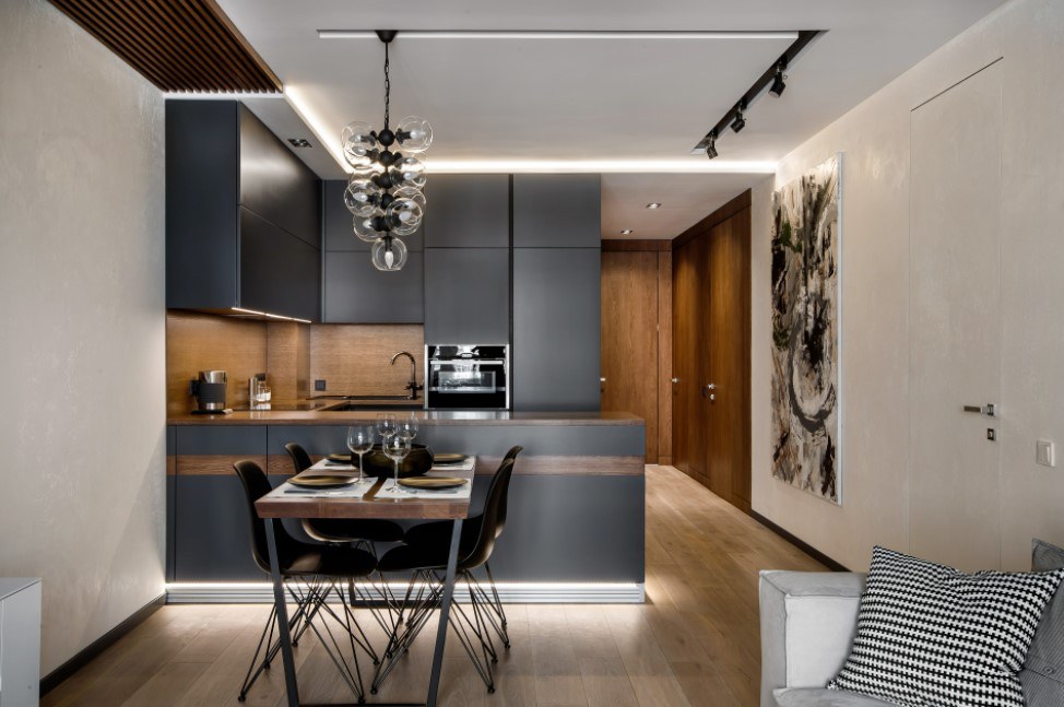 Для кухни характерно многоуровневое освещение. Оно предполагает визуальное разделение помещения на функциональные зоны: столовая, рабочее место и уголок для отдыха. В кухне необходимо предусмотреть возможность регулирования яркости света – это особенно актуально для тёмного времени суток.