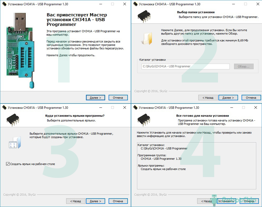 При включенном, режиме Paralell (1 — 2) в разделе «Интерфейсы» появится новое устройство «USB-EEP/I2C… CH341A», а при включенном режиме Serial (2 — 3) в разделе «Порты (COM и LPT)» появится новое устройство «USB-SERIAL CH341A». Теперь необходимо установить программное обеспечение для работы с программатором, в примере использую русифицированную «CH341A — USB Programmer 1.30». Скачиваем и разархивируем архив, запускаем установочный файл, процесс установки не сложный и состоит из четырех этапрв.