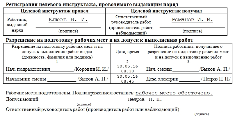 В наряде должны быть указаны ответственные лица, сотрудники, производящие электромонтажные мероприятия, а также члены бригады и проверяющие.