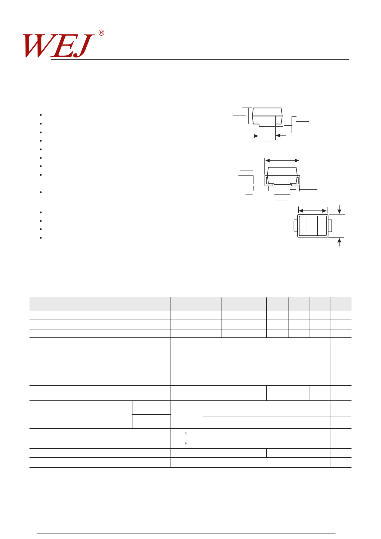 SS12-SS110 NO. TEST ITEM TEST CONDITIONS FORWARD OPERATION TA=25 ℃ RATED AVERAGE RECTIFIERD MIL-STD-750C 1 2 TA=120℃ FOR 168HRS AT VR=80% RATED VR REVERSE BIAS 15PSIG,TA=121℃,4HRS MIL-S-19500 TA=65℃,RH=98%,168HRS MIL-STD-202F ﹣55℃ FOR 168HRS MIL-STD-750C 6 150℃ FOR 168HRS STOREAGE LIFE 260±5℃ FOR 10SEC IMMERSE BODY INTO MIL-STD-750C 7 SOLDER RESISTANCE SOLDER 1/16″±1/32″ METHOD-2031 -55 ℃ /+125 ℃ 30MINUTES FOR DWELLED TEMPERATURE ℃/5MIN,100℃/5MIN,10CYCLES MIL-STD-750C 230℃±5℃/5SEC SHENZHEN YONG ER JIA ELECTRONICS CO. ,LTD WEJ ELECTRONIC CO. Http:// www.wej.cn E-mail:wej@yongerjia.com |