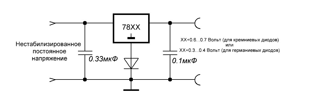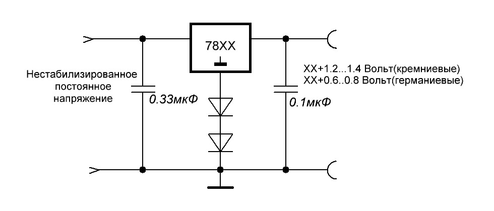 Что мы в результате видим? Видим стабилизатор напряжения и стабилитрон, подключенный к среднему выводу стабилизатора. ХХ – это две последние цифры, написанные на стабилизаторе. Там могут быть цифры 05, 09, 12 , 15, 18, 24. Может уже есть даже больше 24. Не знаю, врать не буду. Эти две последние цифры говорят нам о напряжении, которое будет выдавать стабилизатор по классической схеме включения: