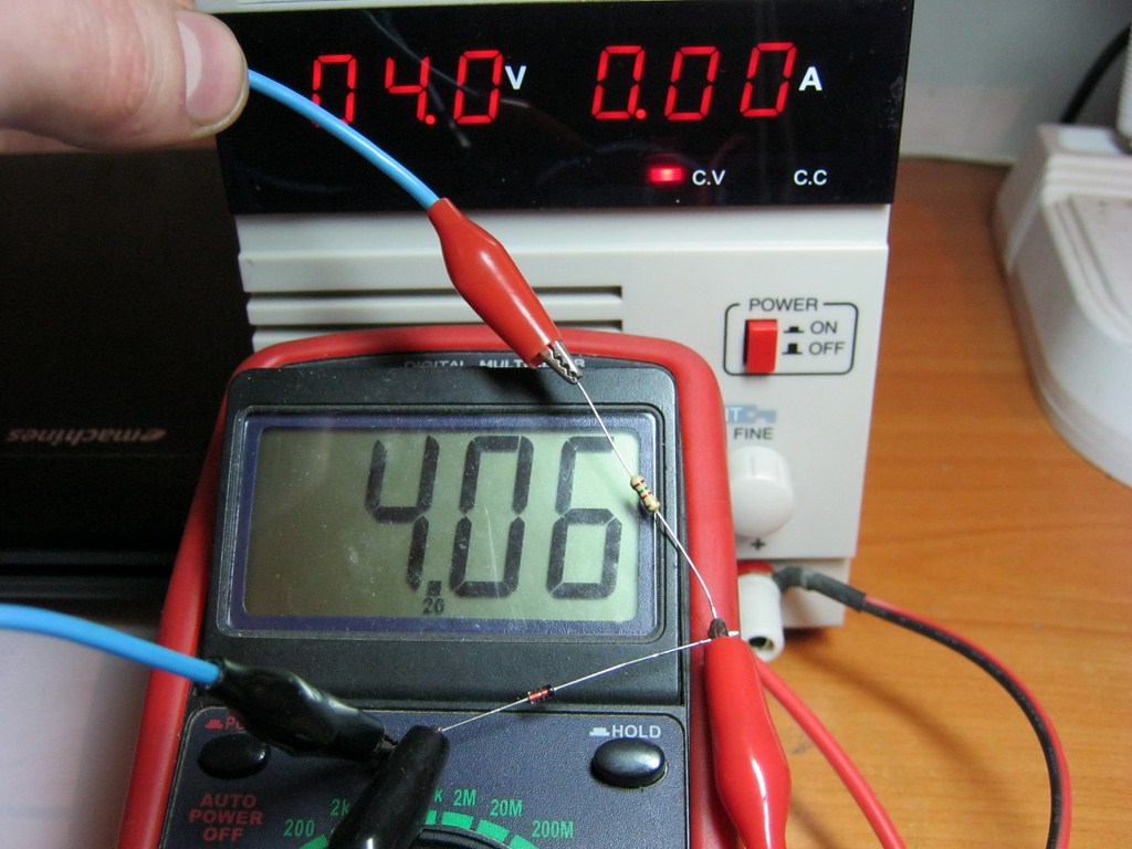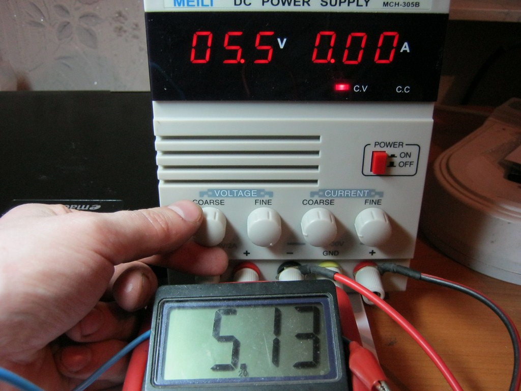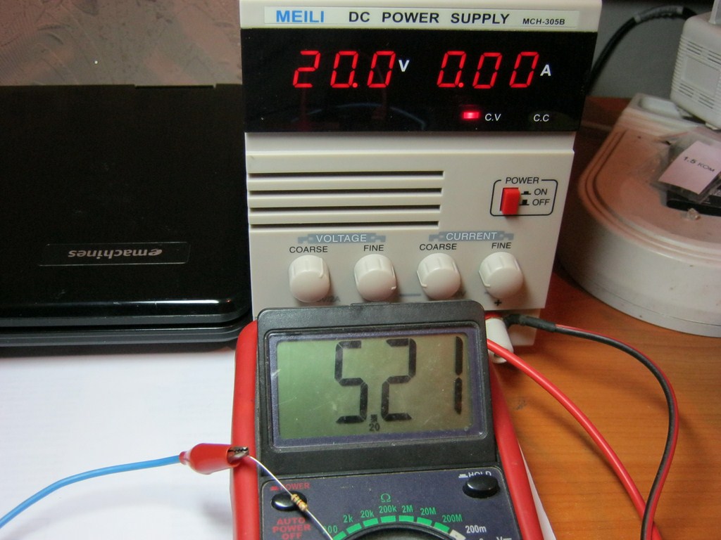 Теперь внимательно следим за показаниями мультиметра и блока питания: