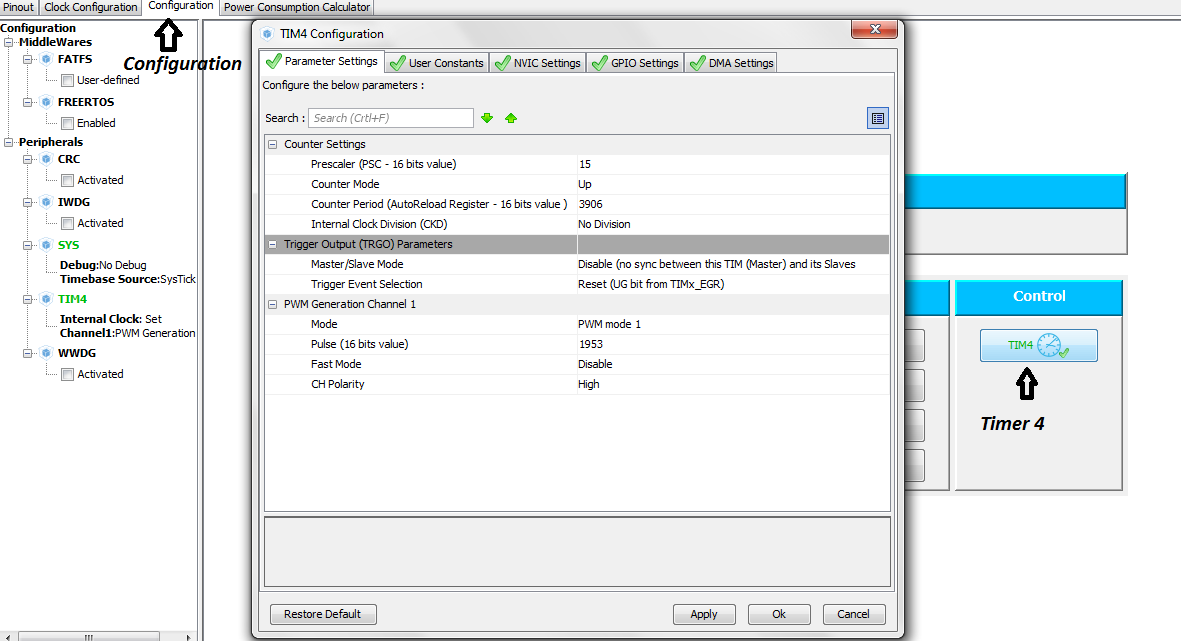 Now we have both the value’s Timer Presaller value, Counter Period/Pwm Resolution(Steps) and also they are in 16-bit range. Now input the values in the timer 4 configuration. I selected the counter to be in UP mode(Count for 0 to 3906). Pulse is the duty cycle in our case its 50% so 3906*50% > 3906*0.5 = 1953.
