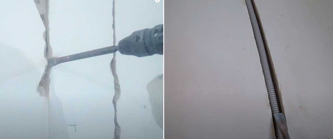Алгоритм изготовления штробы проходит в два этапа — высверливание отверстий на расстоянии 10-15 мм по линии прокладки проводов с последующей заменой насадки (устанавливается специальная лопатка) и удалением перегородок.