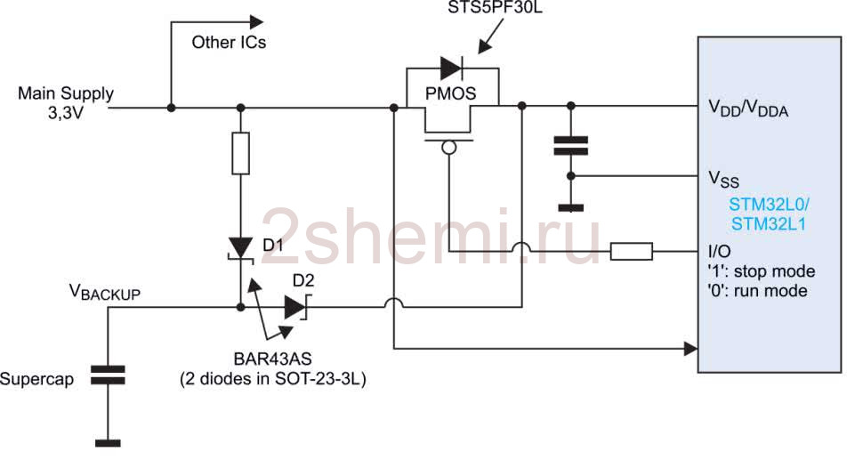 Гораздо лучшим и более универсальным решением является схема питания, показанная на рисунке выше. Дополнительный диод Шоттки, подключенный последовательно с резистором R, предотвращает разряд ионистора от основного источника питания или других блоков устройства. Полевой транзистор позволяет программно выбрать источник напряжения — в состоянии проводимости он обеспечивает путь с низким сопротивлением, который соединяет выводы питания процессора с основным источником питания устройства, и отключение (после обнаружения падения напряжения) позволяет начать разрядку суперконденсатора после перевода микроконтроллера в режим пониженного энергопотребления (STOP).