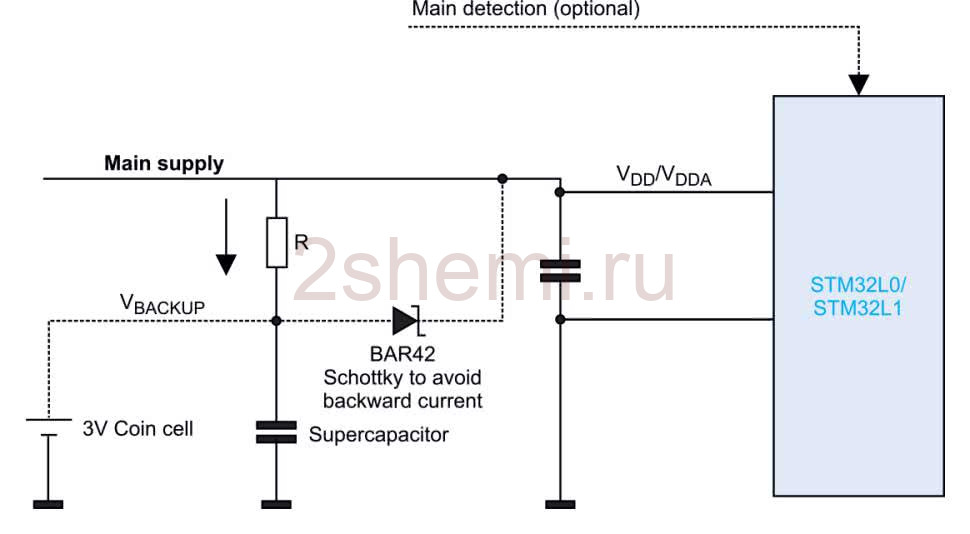 Диод Шоттки защищает схему от обратных токов, благодаря чему зарядка конденсатора возможна только через резистор. Схема адаптирована для питания от источников постоянного напряжения с напряжением, превышающим как минимум на 0,3 В напряжение поддержки, необходимое для правильной работы процессора. Важным требованием является обеспечение высокого сопротивления источника после его выключения, иначе суперконденсатор будет разряжаться непосредственно на источник, что значительно сократит время поддержки.