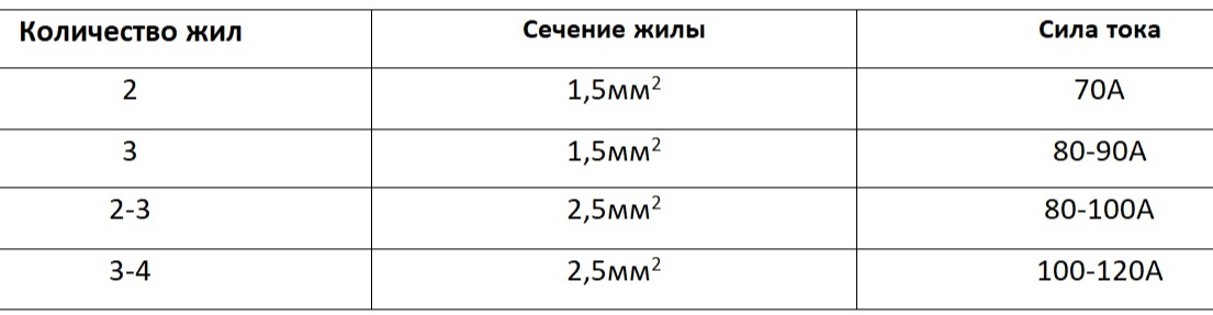 - 3-4 жилы, сечение каждой 2,5 мм² — 100-120 А.