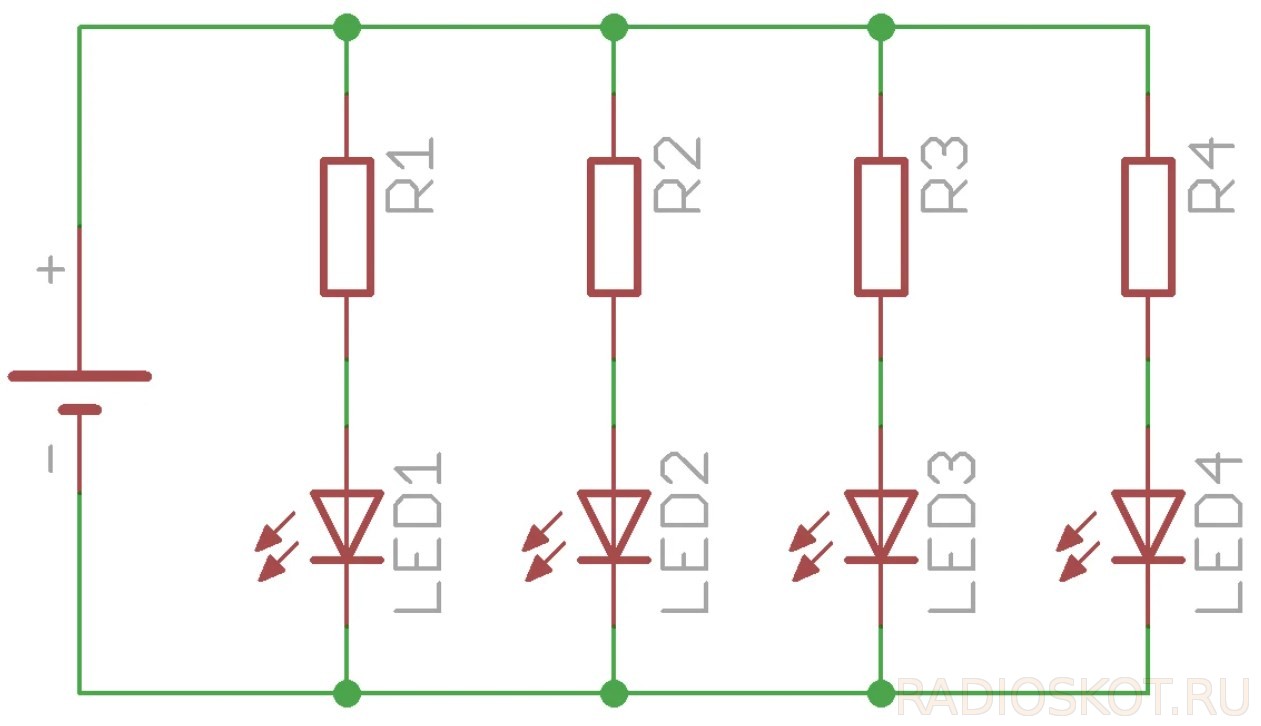 С точки зрения стабилизации рабочих параметров диодов это лучший подход: каждый из них запитан отдельно и не влияет на остальные. Проблемы с одним не повлияют на остальных. К сожалению, такой способ питания связан с большими потерями энергии. Вот пример питания 4-х красных светодиодов — каждый из них подключен через отдельный резистор 330 Ом. При таком подключении на каждый резистор подается напряжение, необходимое для правильного питания одного светодиода. С каждым последующим LED и его резистором потребление тока всей схемы соответственно увеличивается/