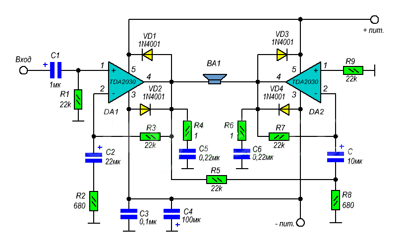 Здесь показан принцип включения TDA2030 используя мостовую схему, гарантирующую мощность на выходе — 28 Вт