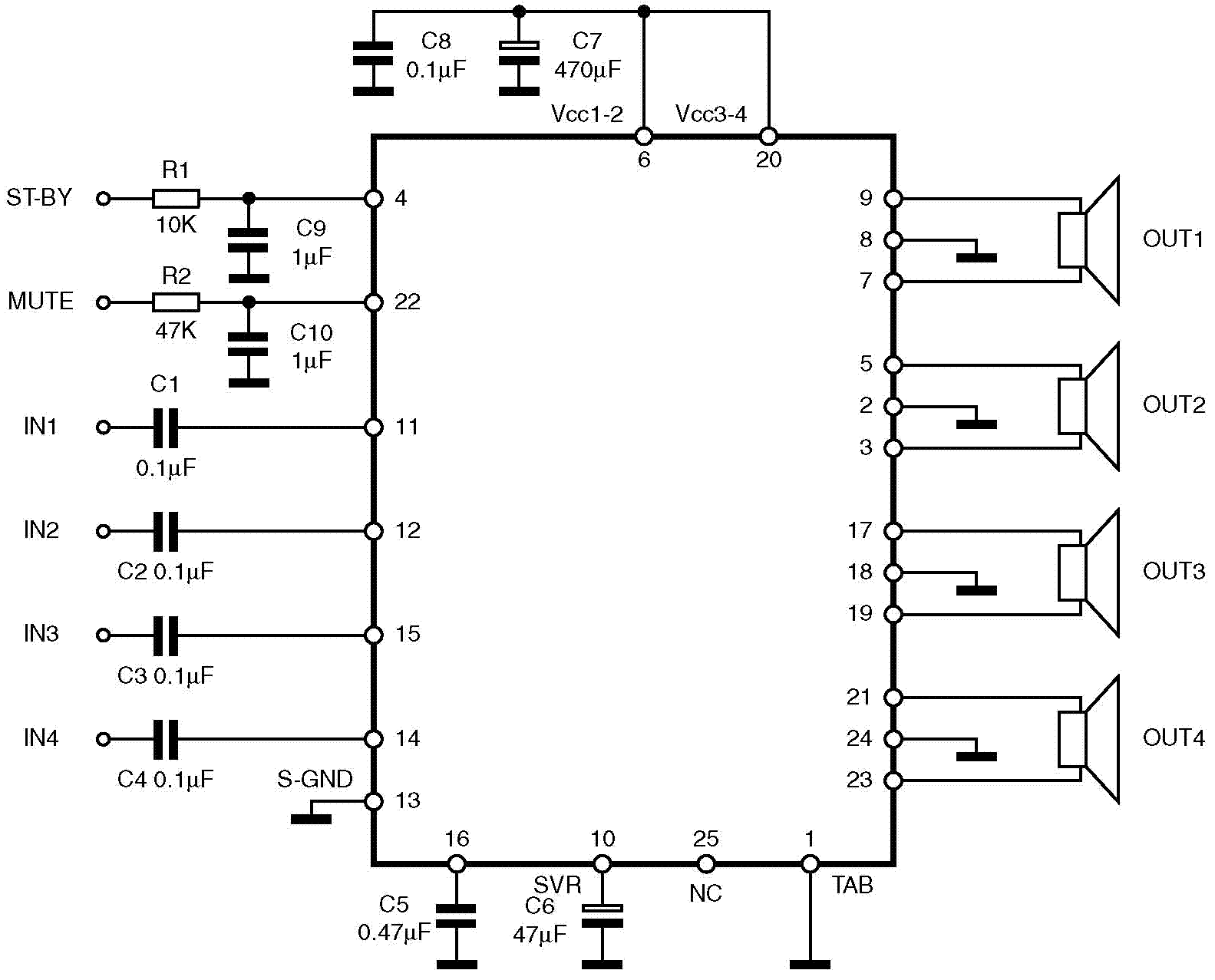 На рисунке представлена схема подключения микросхемы tda7388, конденсатор C6 необходим для регулирования времени выключения/выключения и выполняет значимую роль в оптимизации щелчков при переходных процессах. Минимально значение емкости для такого конденсатора 10 мкФ.