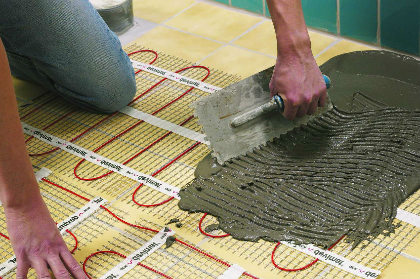 Перед тем, как выполнить утепление пола в ванной до момента укладки системы специально подводят электрокабель к термостату и в завершение заливают стяжку под черновую основу.