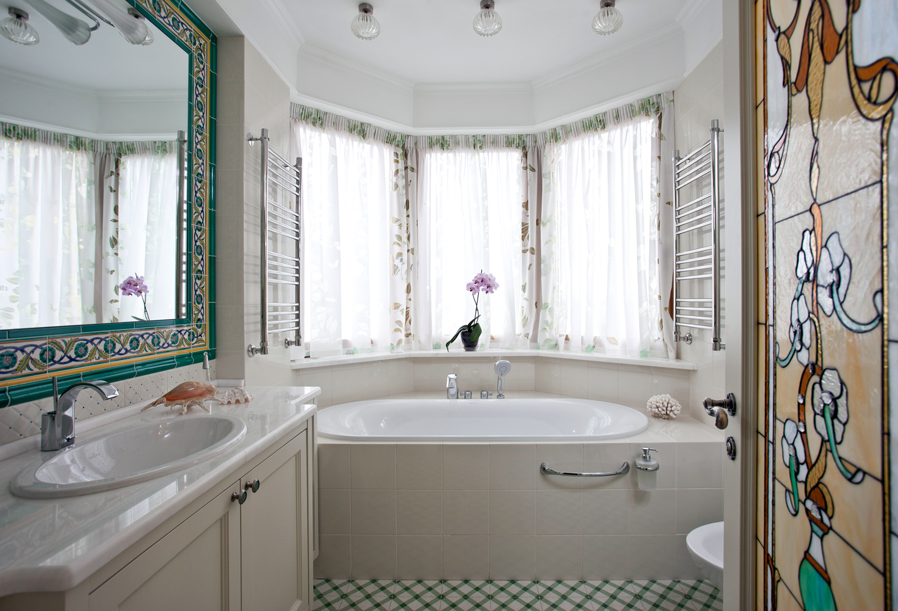 - В случае эркера. Архитектурная особенность разрешает дизайнерам пофантазировать. В большинстве случаев в эркере располагают ванну как место для релаксации. Для установки душевой кабины можно использовать любой угол.