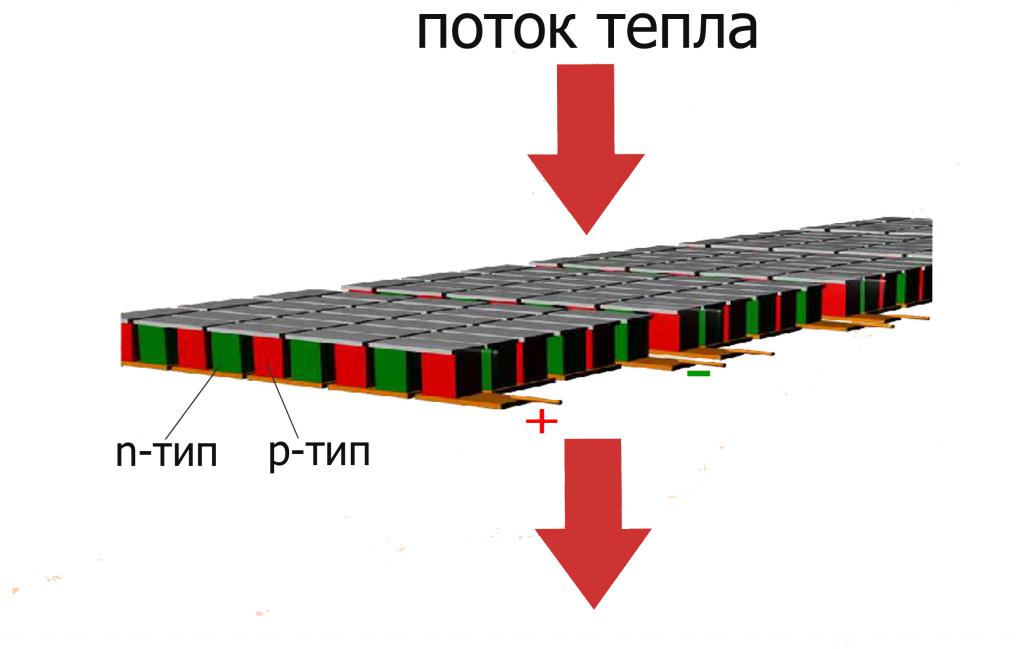 Как же устроены эти термические генераторы? Они состоят из специальных термических батареек, которые изготавливают из материалов проводников, и тепловых обменников разнородных температур спаев термобатарей.