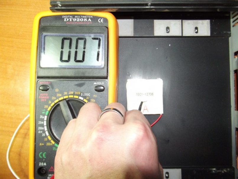 Поскольку нагревающиеся и охлаждающиеся переходы находятся в разных плоскостях, элемент «Пельтье» сверху будет охлаждаться, а снизу нагреваться.