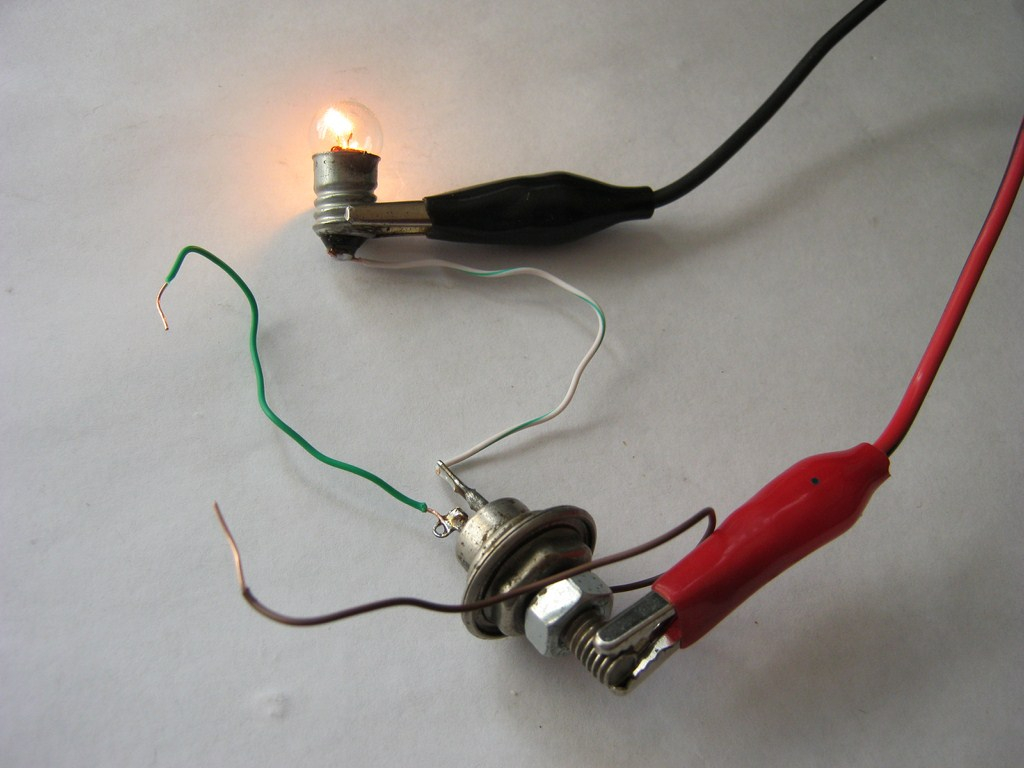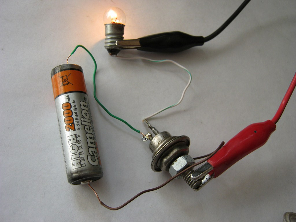 Теперь же нам надо подать относительно анода напряжение на Управляющий Электрод (УЭ). Для такого вида тиристора Uy – отпирающее постоянное напряжение управления больше чем 0,2 Вольта. Берем полуторавольтовую батарейку и подаем напряжение на УЭ. Вуаля! Лампочка зажглась!
