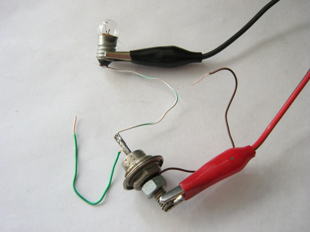 Для проверки тиристора нам понадобится лампочка, три проводка и блок питания с постоянным током. На блоке питания выставляем напряжение загорания лампочки. Привязываем и припаиваем проводки к каждому выводу тиристора.