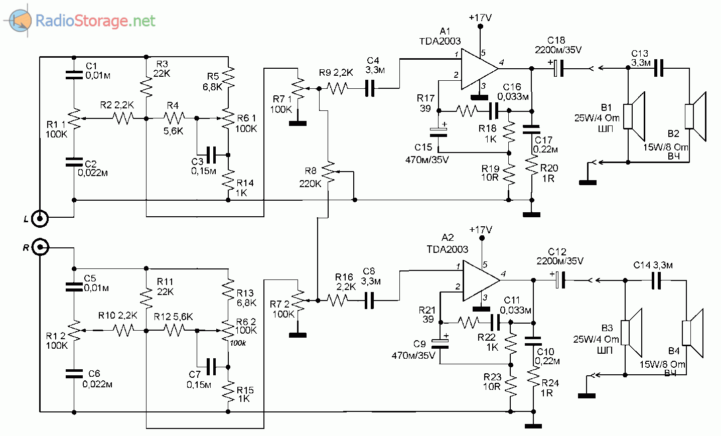 Схема УНЧ показана на рисунке. Она построена на основе двух микросхем TDA2003. Это интегральные УМЗЧ, аналогичные микросхемам К174УН14.