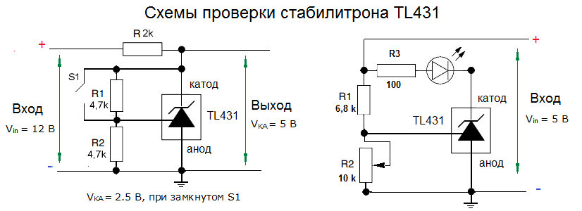 В виртуальном пространстве интернета схем для такой проверки множество. Разницу между ними усмотрел в том, что одни сообщают – сигнализируют о исправности электронного компонента миганием – загоранием светодиодов, другие создают предпосылки для измерения напряжения на выходе, по величине которого и следует судить о исправности TL431. С одной стороны первые вроде как самодостаточны, в дополнение же ко вторым необходим вольтметр. С другой стороны первым нужно «верить на слово», вторые же сами ничего «не решают», а выдают объективную информацию для принятия решения. К тому-же вольтметр всегда под рукой. Выбрал второй вариант, он к тому же ещё и проще, «цена вопроса» — три постоянных резистора.