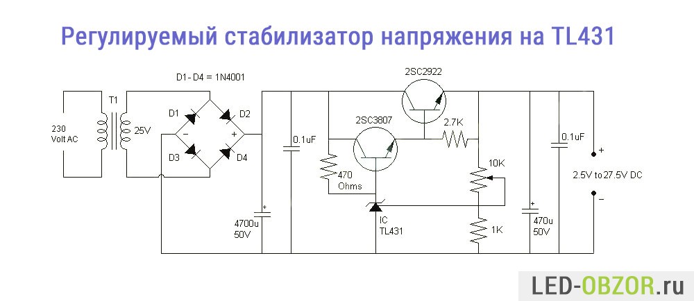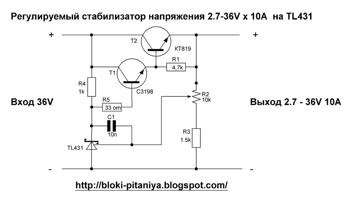 Параллельный стабилизатор TL431 работает так же, как стандартный стабилизатор. Различие уровня напряжения выхода и входа компенсируется благодаря мощному транзистору биполярного типа. Стабилизация будет лучше при условии того, что обратная связь поступает с выхода самого стабилизатора.