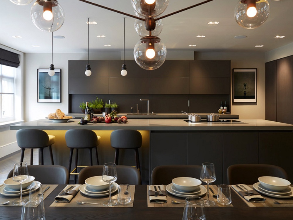 Главная часть кухни и место, где потребность в комфортном свете можно приравнять к освещению рабочего стола. По возможности, разделите несколько участков. Чем больше размер кухни — тем больший простор для вариаций с освещением рабочей зоны.