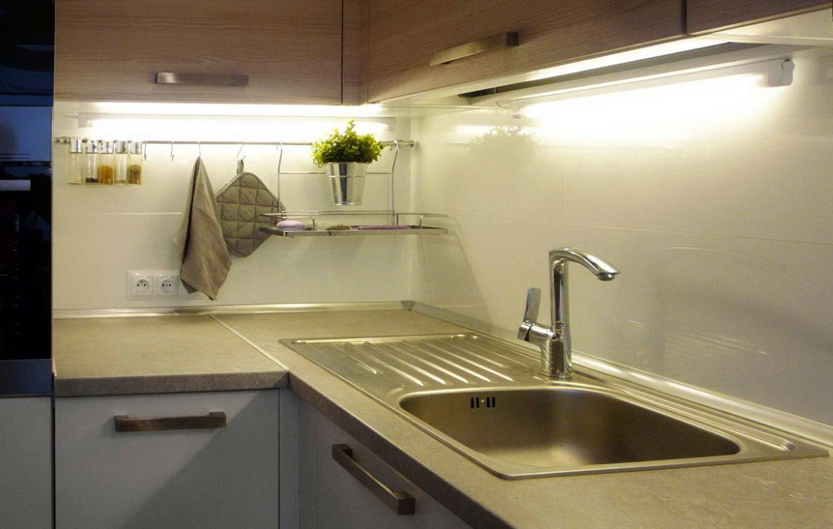 Светодиодная подсветка для кухни – наиболее оптимальный вариант для установки на рабочей зоне. Она отличается небольшим потреблением энергии, удобным расположением светодиодов, обеспечивающим отличный световой поток, равномерностью подачи света и экономичностью.
