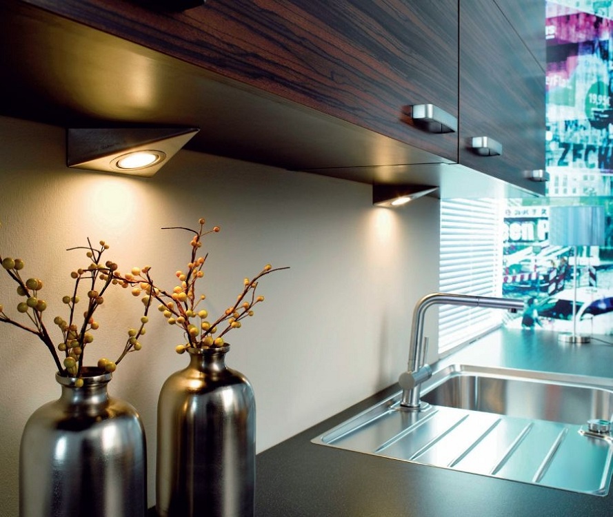 - Подсветка на светодиодных и галогенных лампах очень экономна, а установка точечных светильников с возможностью включения по частям, то есть только там, где нужно в данный момент, например, в рабочей зоне, когда вы готовите, значительно экономит электроэнергию;