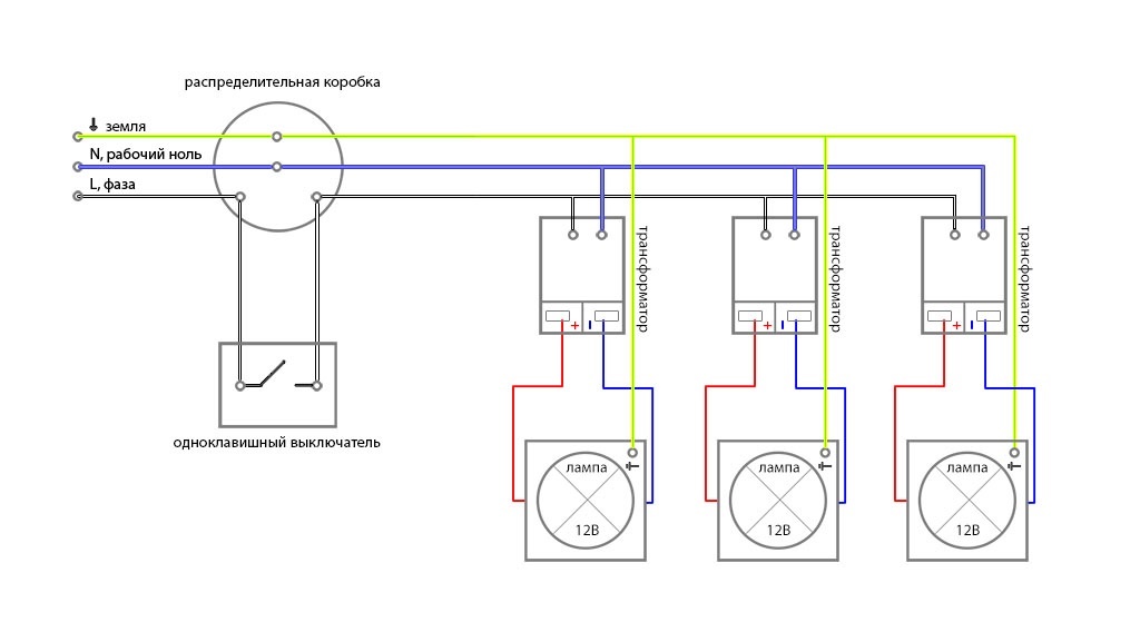 При этом важно соблюдать цветовую маркировку кабелей, так как это облегчит будущий возможный ремонт или переоборудование системы освещения. От трансформатора посредством клемм выхода провода параллельно подключают к галогенным лампам, соблюдая одинаковую длину и сечение отдельных проводов
