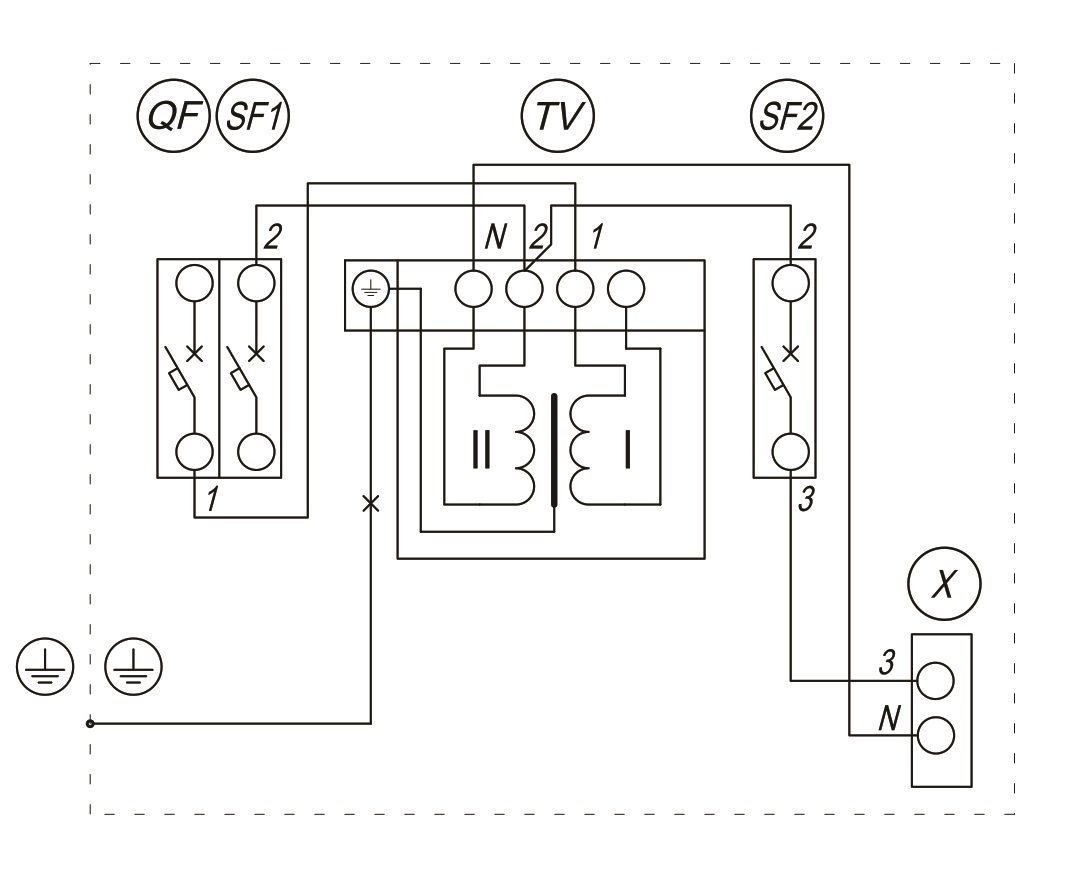 - К контактам вторичной катушки подсоединяют нагрузку, затем на первичку подают 220 В. Аппарат для этого можно подключить напрямую к проводке (скруткой, клеммами), в том числе и непосредственно в щитке, или снабдить его выводы шнуром с вилкой к розетке 220 В и наружной розеткой для подключаемых приборов.