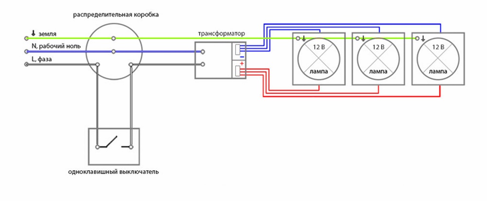 Наиболее замечательный и популярный пример, для наглядной схемы подключения — это подключение экономной системы освещения. Она необходима для реализации схемы освещения с меньшими показателями напряжения, чем классические 220 В. Чаще всего используются 12-вольтные галогенные лампы, которые применяют как в открытых, так и во встроенных светильниках.