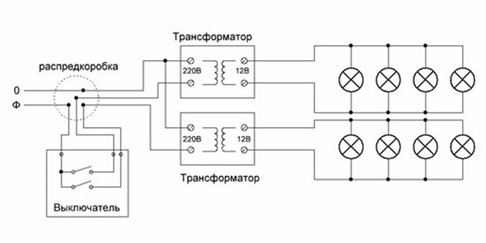 Похожим образом, имея два трансформатора, легко осуществить подключение к двухклавишному выключателю, что позволит управлять двумя независимыми друг от друга половинами системы освещения.