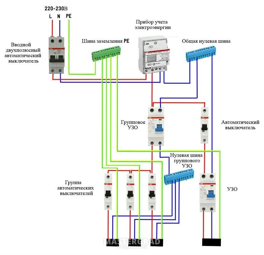 Имейте в виду, что широкое распространение получила ещё одна разновидность такой схемы, в ней между вводным автоматом и УЗО принято устанавливать счётчик электрической энергии.