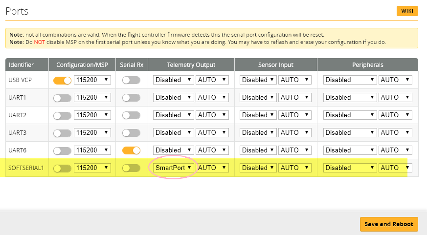 Включаем фичу «SoftSerial» в Betaflight, теперь вы должны увидеть SoftSerial1 на закладке Ports. Выбираем «SmartPort» в столбце «Telemetry Output»