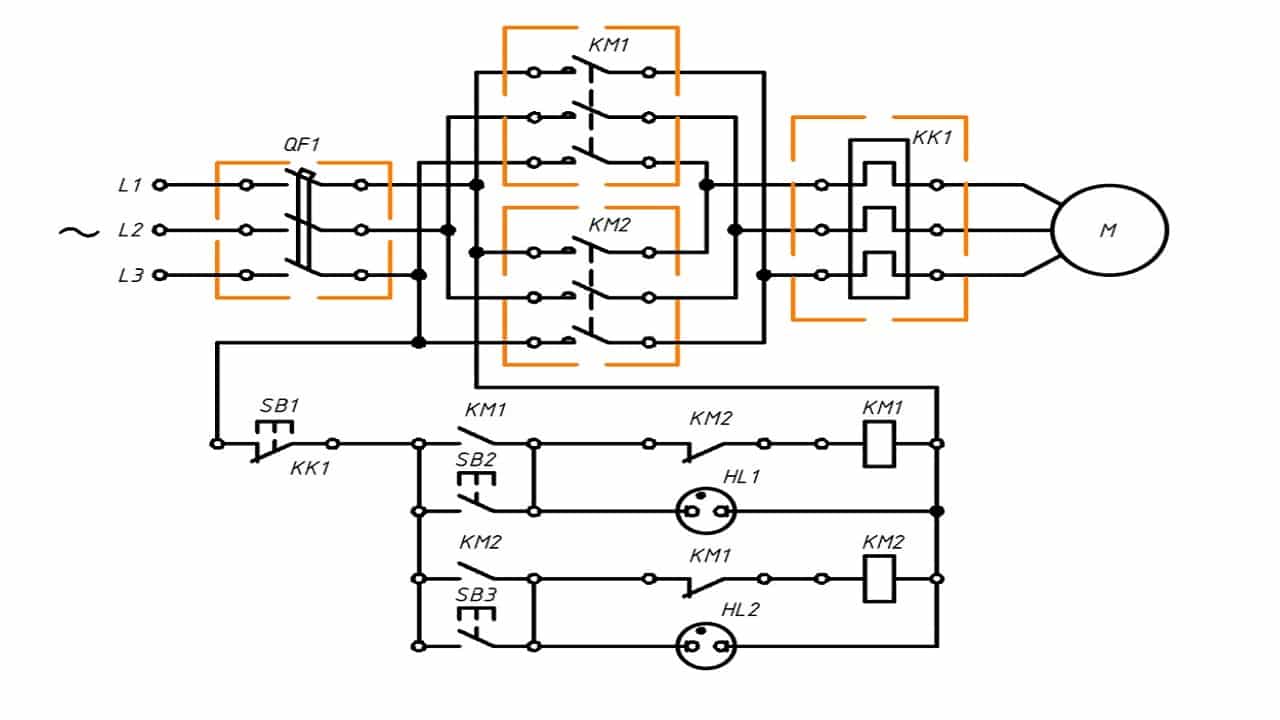 Рассмотрим нереверсивную схему пуска асинхронного электродвигателя (рисунок 9). Здесь, через трехполюсный автомат QF1 питание подается на пускатель KM1. При нажатии кнопки SB2 произойдет подача напряжения на обмотки электродвигателя, его остановка осуществляется кнопкой SB1. Тепловое реле KK1 применяется для контроля температуры нагрева, а лампочка HL1 сигнализирует о включенном состоянии контактора.
