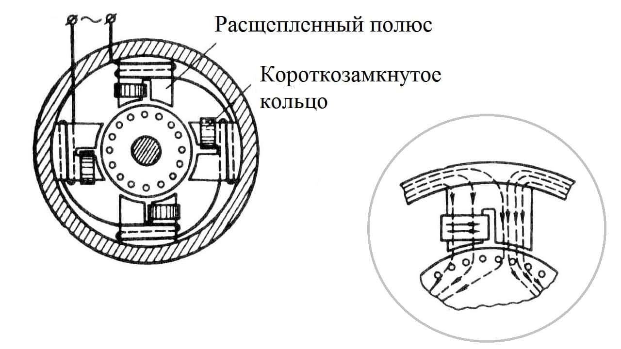 Такой двигатель становится способным к самостоятельному запуску, однако имеет трудности с реверсом. Поскольку в современном электроснабжении не используются двухфазные сети, фактически электродвигатели этого рода применяются в однофазных сетях с включением второй фазы через фазовращающий элемент (обычно – конденсатор).