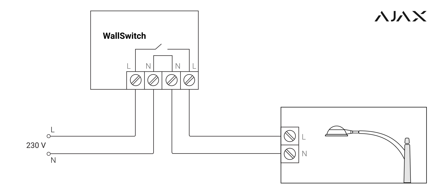 WallSwitch и уличное освещение можно подключить к одному источнику питания. Подключите WallSwitch к цепи питания уличного освещения согласно схеме ниже и настройте систему.