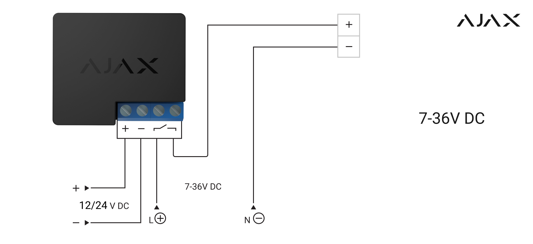 Relay питается от источника питания 12/24 В. Уличное освещение запитывается от другого источника питания с напряжением 36 В. Подключите Relay к цепи питания уличного освещения согласно схеме ниже и настройте систему.