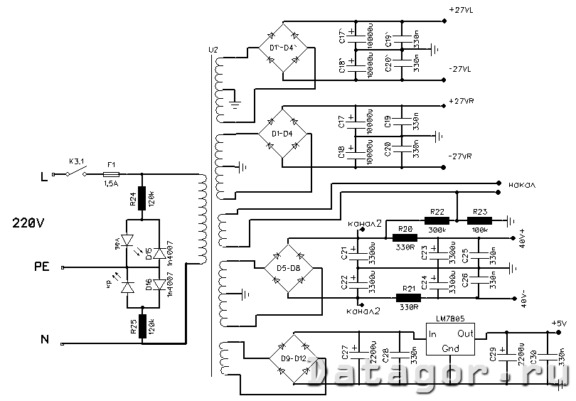 - Трансформатор: 230 В/2×27 В/300 ВА