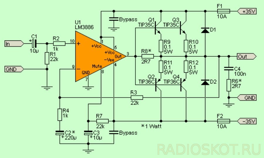 Схема усилителя обеспечивает мощность, которая достигает реальных 100 Вт (эффективное синусоидальная), при входном напряжении в районе 600 мВ и сопротивлением нагрузки 4 Ома.