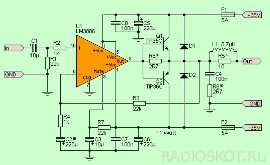 - Однако схожий по свойствам усилитель можно собрать по схеме класса «А», где входной и выходной сигналы повторяют друг друга, а мощность звука достигает 15 Ватт.