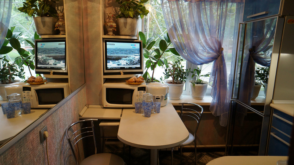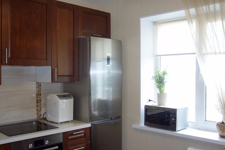 Если кухонная площадь совсем небольшая и определиться с тем, куда поставить микроволновку в маленькой кухне проблематично, можно использовать для этого подоконник. Стоит учесть, что ширина подоконника должна быть довольно большой, чтобы электроприбор поместился на нем.
