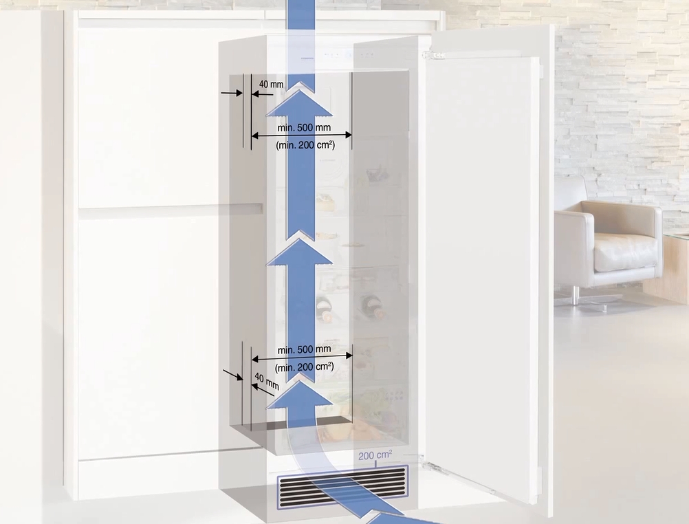 - Сверка размеров холодильника с размерами ниши под встраивание — обязательным условием являются вентиляционные зазоры и отверстия в нужных местах.