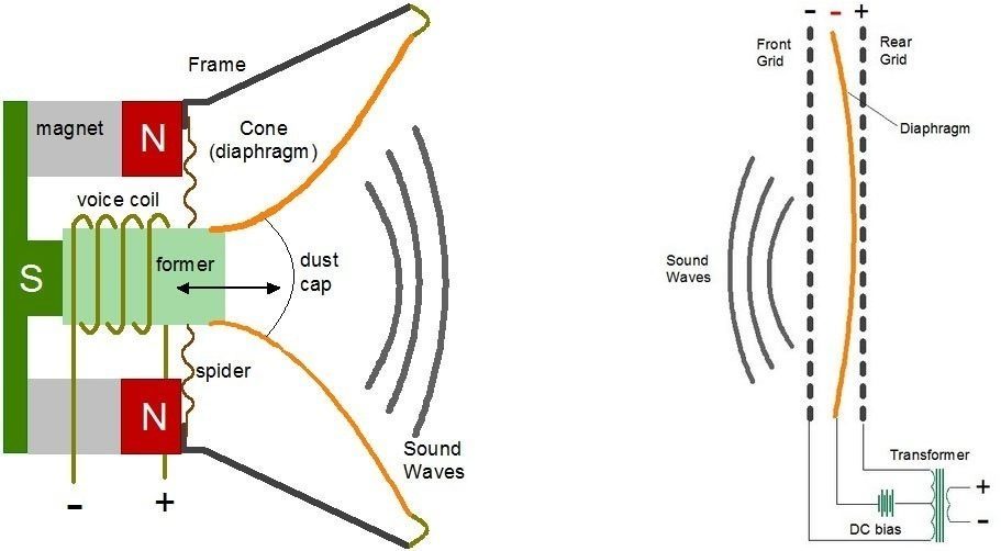 Самое главное — источником звуковых колебаний является именно тонкая пленка (еще ее называют мембрана или диафрагма). Если мы вспомним известный всем динамик, то в нем сразу видны недостатки, следующие из самого принципа его работы. В динамике используется катушка с током, размещенная в цилиндрическом магнитном зазоре. Вся излучающая поверхность приводится в движение этой катушкой.