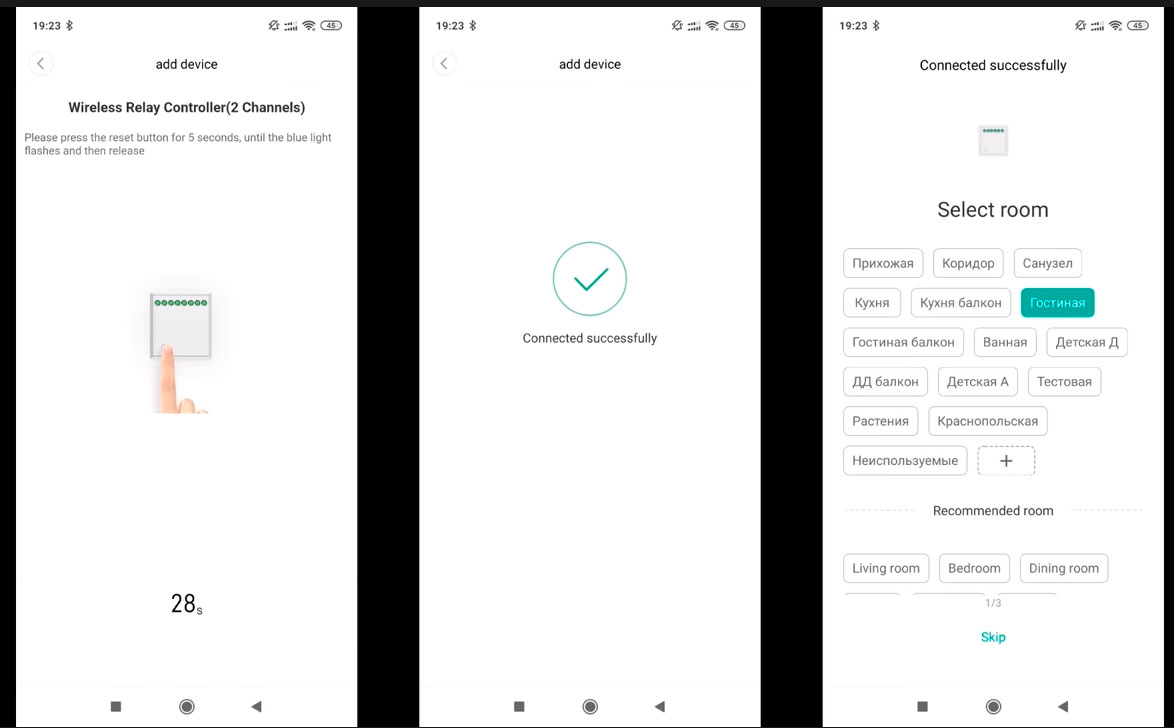 После этого на реле требуется нажать кнопку и удерживать ее в течение 5 секунд, пока не начнется мерцание светодиода. Через некоторое время устройство сообщит об успешном сопряжении.