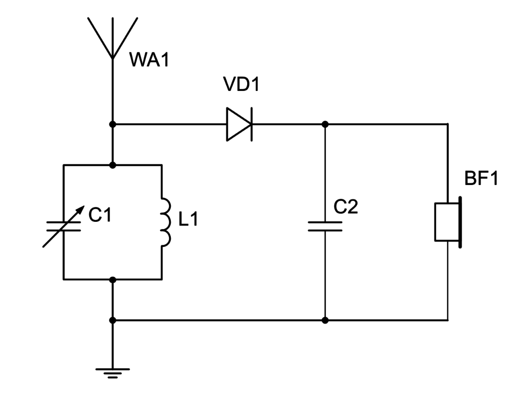 Схема простейшего детекторного приёмника:Он состоит из антенны и заземления подключённых к колебательному контуру из катушки L1 и переменного конденсатора C1, диодного детектора на диоде VD1, фильтра нижних частот, образованного C2 и сопротивлением наушников BF1, и самих наушников.