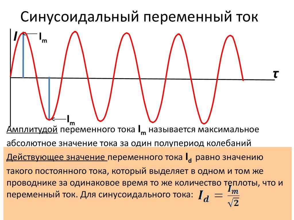 Постоянный электрический ток по определению — это ток, который течёт только в одном направлением и не меняет его со временем. Переменный ток характерен тем, что меняет свое направление и величину со временем. Если графически постоянный ток отображается как прямая линия, то переменный ток течет по проводнику по закону синуса и графически отображается как синусоида.