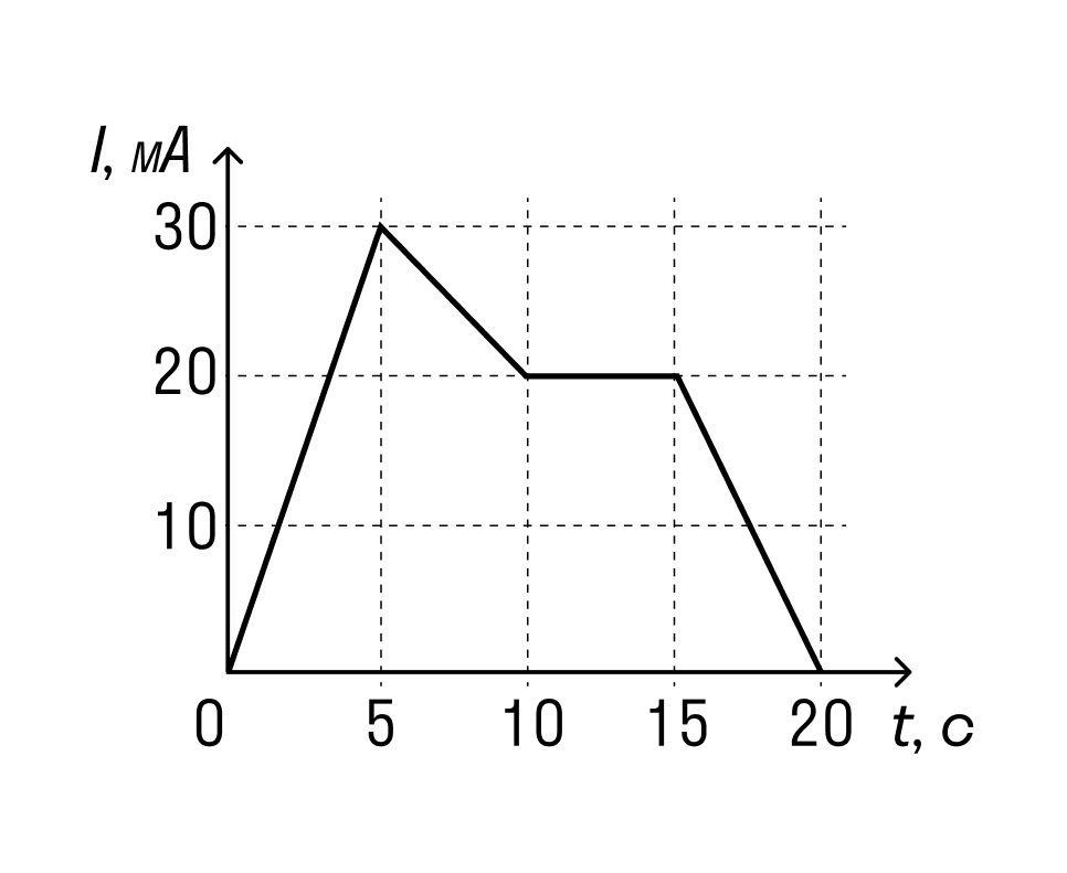 На рисунке приведен график зависимости силы тока от времени в электрической цепи, индуктивность которой 1 мГн. Определите модуль ЭДС самоиндукции в интервале времени от 15 до 20 с. Ответ выразите в мкВ.