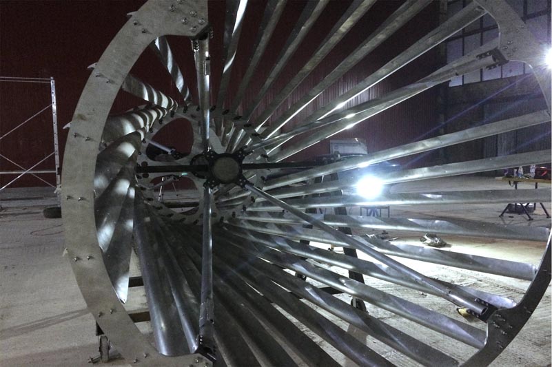 В результате мы создали действительно компактную ветровую установку, на базе которой можно строить распределенные сети. Конструкция ротора, позволившая добиться требуемой компактности, высокой механической прочности, низкой частоты вращения и пусковой скорости оказалась не совсем традиционной и представляет собой гиперболоидную оболочку, построенную из алюминиевых лопастей с оптимальным аэродинамическим профилем.