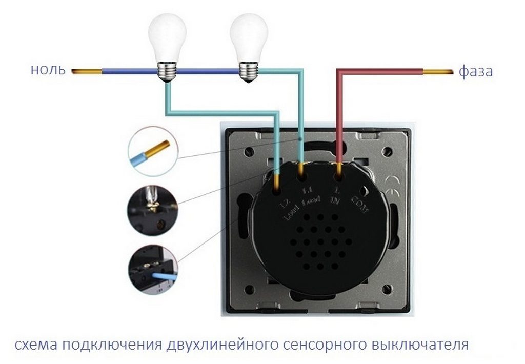 Дальше фазу от щитка нужно подключить к клемме с фазой. А идущий на лампу 0 — к нулевой клемме. После этого — вмонтировать новый выключатель в подрозетник, закрепив его, как обычный, распорными лапками. Рамку можно закрепить еще и на винты. Остается вставить сенсор, включив автомат. После этого можно включать освещение.